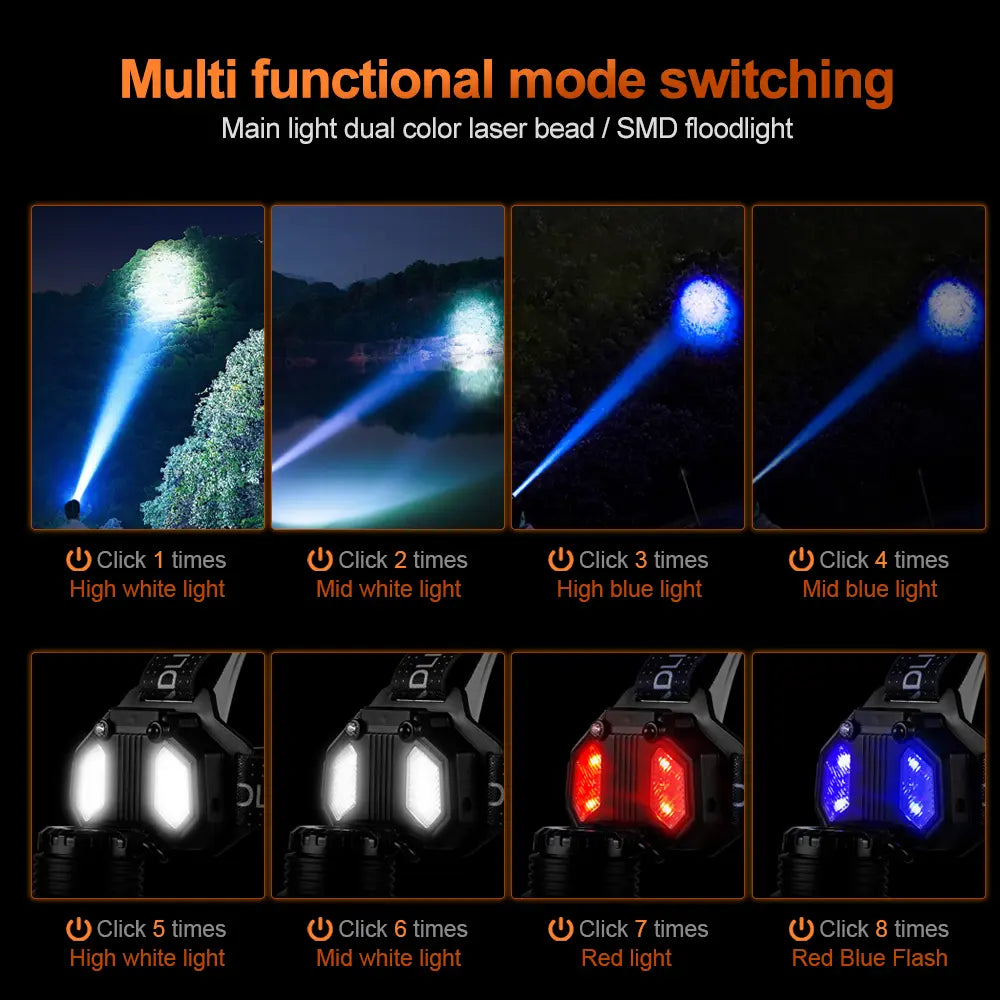 Helius H-8501-1 is a next-generation headlamp combining dual TG white laser beads with COB/SMD multi-light technology—delivering up to 10,000 lumens of brilliant output. With both white and blue laser options plus red/blue flash emergency modes, this headlamp is built for professional workers, outdoor adventurers, and safety responders.