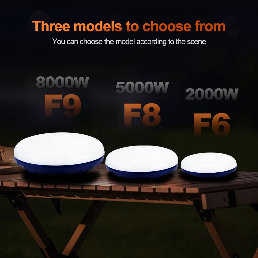 Helius F6 /F8 /F9 ( 2000W / 5000W /8000W) is not just a camping lamp — it’s a multi-function survival tool. With 8000W brightness, 12-hour runtime, bidirectional charging, and waterproof protection, it works as both a light source and power bank, making it a must-have for campers, travelers, vendors, and emergency kits.
