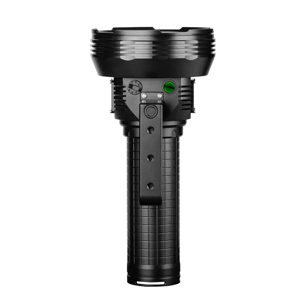 Helius H24C is a high-output rechargeable search light designed for distributors and professional buyers serving the outdoor, emergency, security, and camping equipment markets. Built with a rugged aluminum alloy housing and powered by eight 21700 lithium batteries, this model delivers extreme brightness, long runtime, and stable flood illumination for large-area lighting needs.